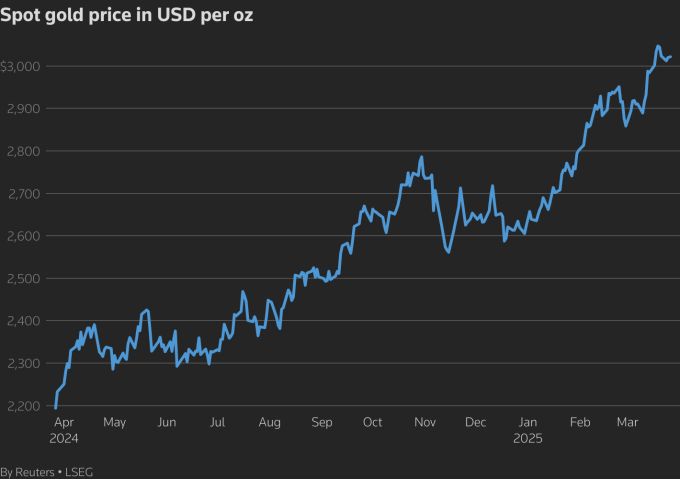 Vốn được coi là hàng rào phòng hộ trước bất ổn và lạm phát, giá vàng đã tăng hơn 15% kể từ đầu năm, lập đỉnh 3.057,21 USD mỗi ounce vào ngày 20/3 và đang dao động quanh mức 3.024 USD mỗi ounce.