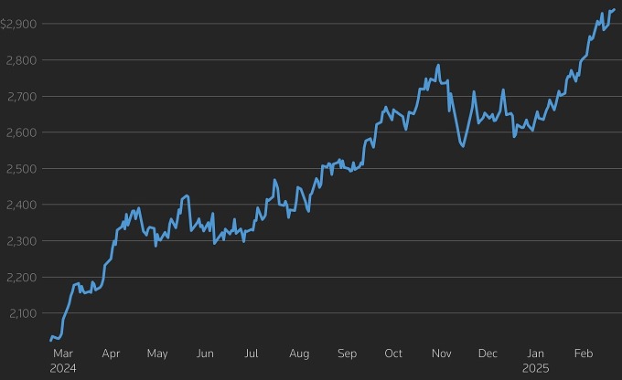 Chốt phiên giao dịch 20/2, giá vàng thế giới giao ngay tăng 6 USD lên 2.938 USD một ounce. Trong phiên, giá có thời điểm lập đỉnh mới tại 2.955 USD. Đây là lần thứ 10 thị trường ghi nhận mức cao kỷ lục trong năm nay.