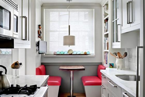 Đối với những căn hộ rộng rãi thì nhà bếp và phòng ăn thường là hai không gian riêng biệt. Tuy nhiên, tùy điều kiện thực tế mà chúng ta có thể khéo léo kết hợp hai khu vực chức năng này vào làm một. Dĩ nhiên, chức năng của bếp vẫn chiếm ưu thế hơn, còn khu vực ăn uống sẽ bố trí vào một góc nhỏ. Thường sẽ là quầy bar hoặc tận dụng góc nhỏ, nơi vị trí cửa sổ để đón ánh sáng tự nhiên để tránh sự bí bách trong không gian nấu nướng của người nội trợ.