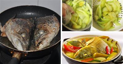 Đầu cá làm sạch (khử tanh bằng cách xát muối kỹ), để ráo cho vào dầu nóng già rán sơ lên cho thơm (lưu ý khi rán cần nhẹ tay kẻo đầu cá bị nát, sứt mẻ), sau đó để ráo dầu.