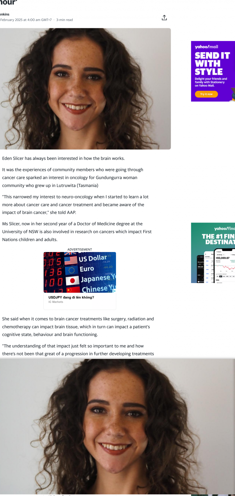 Slicer, hiện là nghiên cứu sinh năm thứ hai của chương trình Tiến sĩ Y khoa tại Đại học New South Wales, cũng tham gia nghiên cứu về các bệnh ung thư ảnh hưởng đến trẻ em và người trưởng thành thuộc nhóm người Thổ dân.
