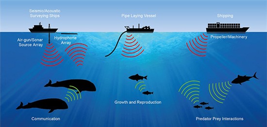 Trong đó, những tiếng ồn cực lớn tạo ra khi thăm dò khí đốt và dầu mỏ có sức tàn phá ghê gớm nhất, vì chúng gây nhiễu loạn sóng âm của sinh vật biển, khiến chúng mất khả năng tìm thức ăn, stress, thậm chí "lạc lối" trôi vào bờ.