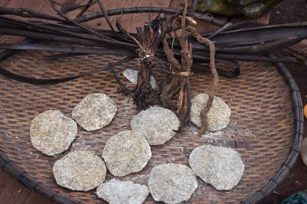 Đã gần 40 năm nay, bà Siu Á vẫn chung thủy với nghề làm men rượu cần truyền thống. Căn nhà sàn đượm màu thời gian nằm giữa làng Bang Ngol hầu như lúc nào cũng chất đầy những ghè rượu cần. Vừa bước chân lên sàn nhà, chúng tôi đã nghe mùi men rượu phả ra thơm nồng. Bà Siu Á khéo léo lấy từng nguyên liệu trên gác bếp xuống đặt vào chiếc nia rộng và bắt đầu câu chuyện về men rừng.
