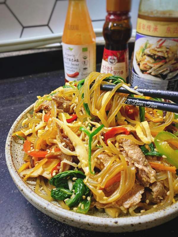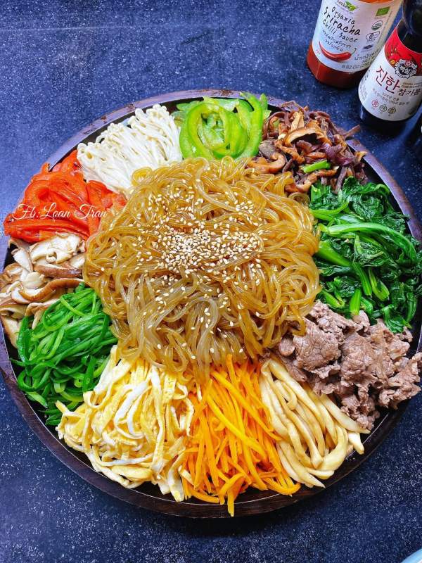 Nguyên liệu: 200g miến Hàn Quốc, 150g thịt bò, 2 quả trứng gà, 200g cải bó xôi hoặc rau cải ngọt, 1/2 củ cà rốt, 1 gói nấm kim châm, 3 cái mộc nhĩ ngâm nở, 1 quả dưa chuột to, 1/3 quả ớt chuông xanh, 1/3 quả ớt chuông đỏ, vài cái nấm hương khô ngâm nở, mè rang, gia vị: xì dầu, tỏi, tương ớt, đường, dầu mè.