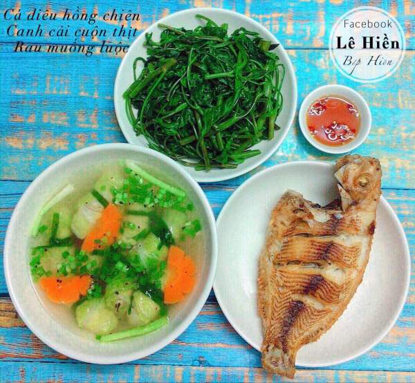 Rau muống luộc - Cá diêu hồng chiên - Canh cải cuộn thịt