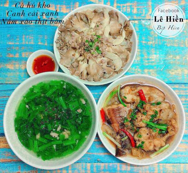 Cá hú kho - Canh cải xanh - Nấm xào thịt băm