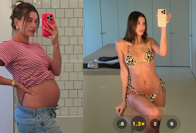 Vóc dáng Hailey khi mang thai và sau gần một năm sinh con trai đầu lòng.