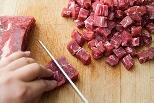 Thịt bò mua về cần thái thành miếng vuông vừa phải để thịt nhanh mềm. Thịt cần được thái ngang thớ để khi ăn miếng thịt mềm và dễ nhai hơn. Thái dọc thớ sẽ làm thịt bị khô, dai.