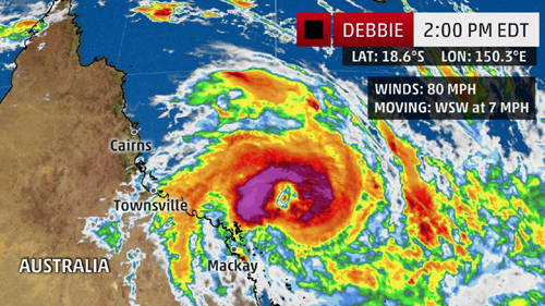 Hình ảnh cơn bão Debbie đang đe dọa Australia. Ảnh: weather.com