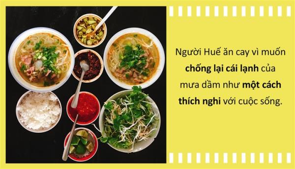 Ngày xưa ở Huế còn có làng Phong Lai được cho ăn ớt trừ cơm vào những ngày vụ mùa thất bát, đủ thấy người Huế ăn cay “siêu đẳng” đến cỡ nào! Lý giải cho đặc điểm ẩm thực này là do người dân muốn chống lại cái lạnh và mưa dầm, như một phương thức thích nghi với cuộc sống.