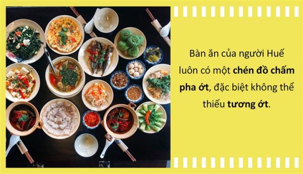 Hằng ngày, trên bàn ăn của người Huế (gồm món canh, cá, thịt, dĩa rau sống…) luôn có một dĩa muối tiêu ớt, dĩa tương ớt hay một chén nước mắm ớt tỏi. Đặc biệt không thể thiếu tương ớt.