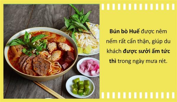 Đầu tiên, phải kể đến bún bò Huế với nước bún, thịt bò, giò heo, chả tôm, gạch cua, huyết… được người phụ nữ Huế nêm nếm sả, ớt màu, ớt bột, tiêu, tỏi, hành… rất tính toán, cẩn thận. Ăn bún bò Huế vào những ngày mưa rét, du khách sẽ có cảm giác cả thân thể được sưởi ấm tức thì bởi sức nóng hừng hực khi áp tay vào tô bún bò Huế vừa mới được múc từ nồi đỏ lửa đem lên.