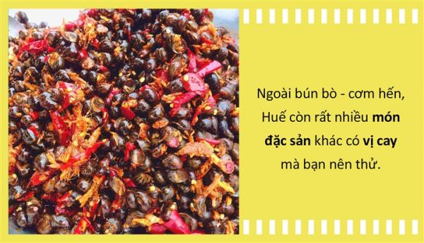 Ngoài bún bò, cơm hến, Huế còn có rất nhiều những món ăn có vị cay khá thú vị. Đó là vị cay của sả, ớt trong món ốc Trường An; vị cay của nước mắm ớt trong tô bánh canh Nam Phổ, trong đĩa bánh lọc bà Đỏ Nguyễn Bỉnh Khiêm; vị cay của đĩa muối ớt ở quán chân gà nướng Mai Thúc Loan; vị cay của nồi nước lẩu dê Kim Long, lẩu hải sản Thuận An…