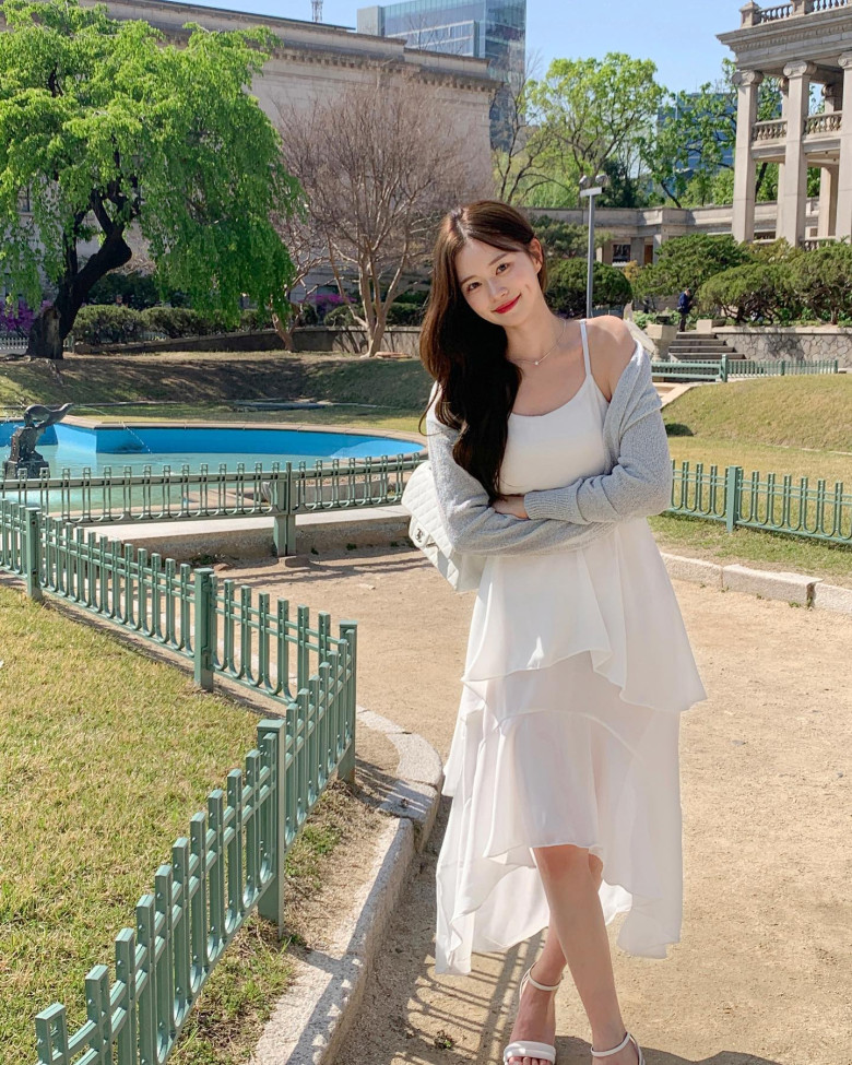 Nàng thơ dạo bước giữa nắng xuân với đầm trắng hai dây bay bổng, phối cùng áo len khoác hờ và sandals cùng tông giúp tổng thể thêm phần tinh tế, trẻ trung và trong trẻo như khung cảnh phía sau.