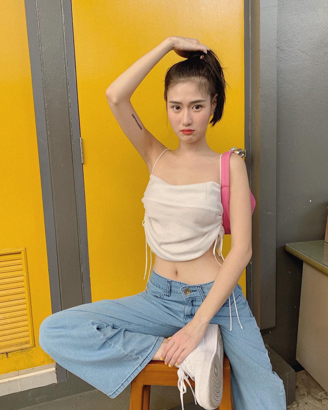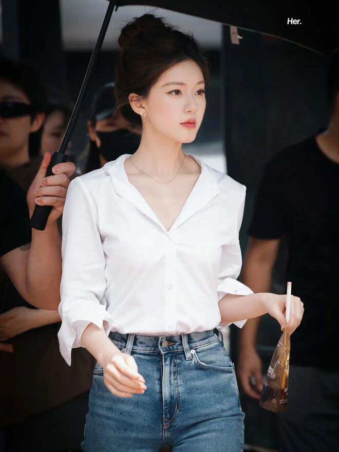 Thanh lịch và sắc sảo với sơ mi trắng cổ mở nhẹ, kết hợp jeans cạp cao tôn dáng. Layout tối giản nhưng đầy khí chất, đậm chất “city chic” – hoàn hảo cho một ngày làm việc bận rộn hoặc street style mùa hè.