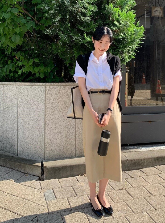 Phong cách công sở thanh lịch với áo sơ mi trắng cổ điển phối chân váy be dáng suông dài giúp chị em thoải mái trong từng bước đi.