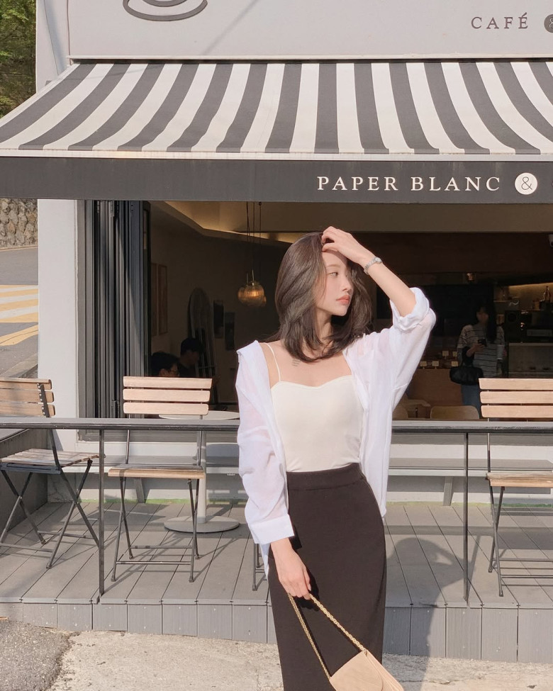 Chiếc áo hai dây lụa mỏng manh cùng sơ mi voan trắng tạo nên lớp layering mềm mại, gợi cảm vừa đủ, tôn lên vẻ đẹp thanh lịch giữa nắng chiều quán cà phê.