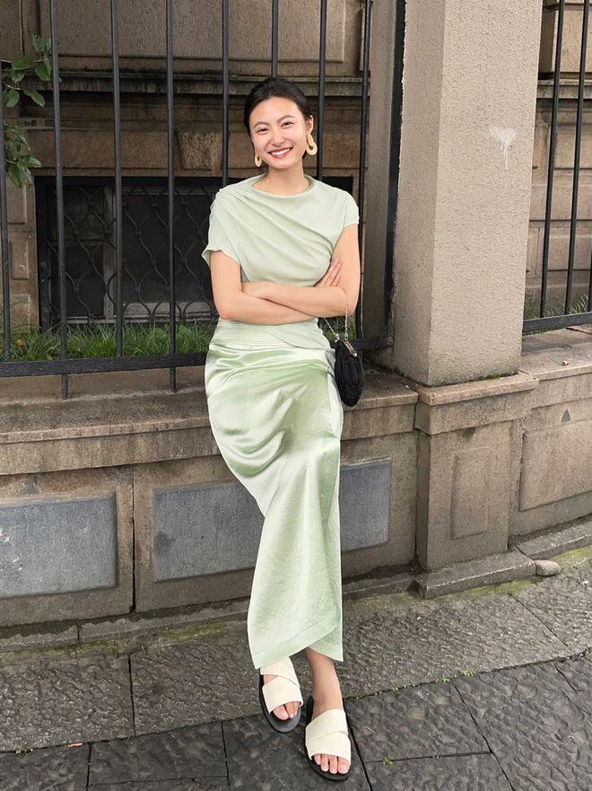 Bộ đầm lụa xanh pastel tươi mát, kết hợp sandal bản to và phụ kiện tối giản, mang tinh thần effortless chic đậm chất hè châu Âu thanh lịch và phóng khoáng.
