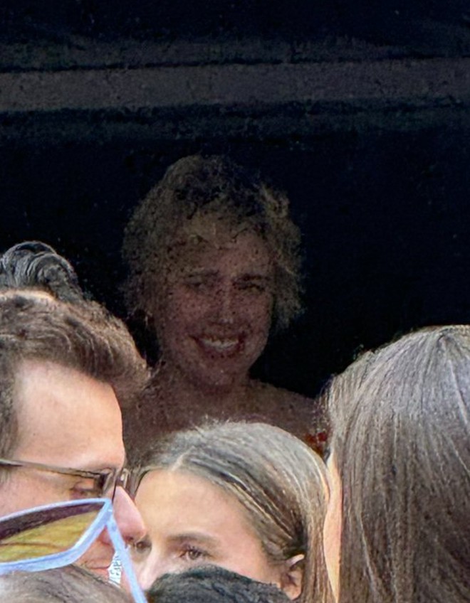 Nhà làm phim Mỹ Greta Gerwig (trái) và Liam Hemsworth cũng hòa mình vào đám đông. Ảnh: X.