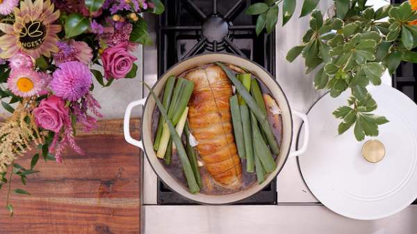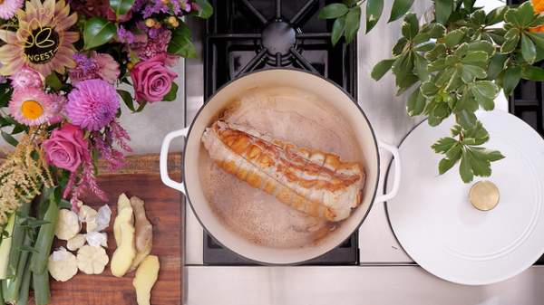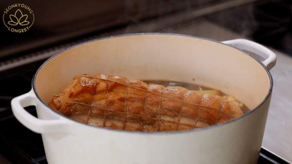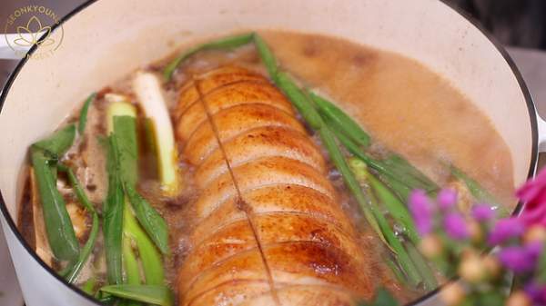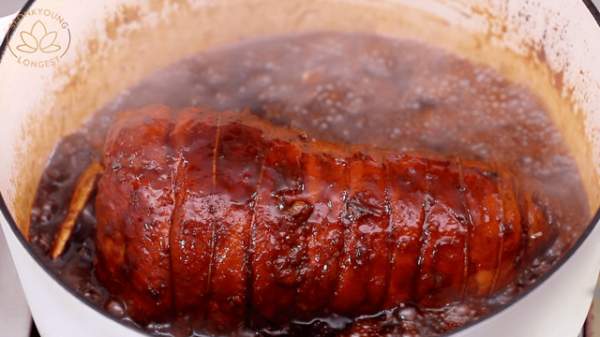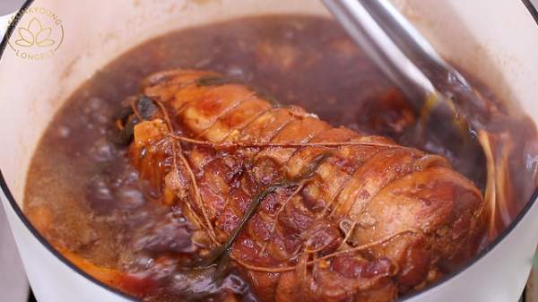 Bước tiếp theo, đổ nước sốt vào nồi thịt áp chảo, thêm tỏi tây, gừng và tỏi vào và đảo đều tay đến khi thịt ngấm đều nước sốt. Đun trên lửa lớn đến khi sôi thì đậy nắp vào, sau đó ninh thịt trên lửa vừa trong 1 tiếng rưỡi (Lưu ý: Cứ cách 20 phút, dùng kẹp lăn đều để khúc thịt chín và thấm đều nước sốt).