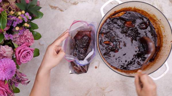Bắt nồi thịt ra khỏi bếp và để nguội khoảng 30 phút, sau đó, cho khúc thịt lợn vào túi Zip cùng với một ít nước sốt, đậy chặt và để qua đêm trong tủ lạnh.