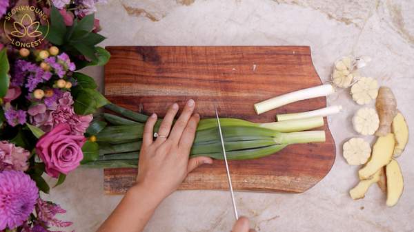 Cắt đôi 2 củ tỏi, thái lát gừng và thái 1 bó tỏi tây (hành boa rô) hoặc 2 bó hành lá thành từng đoạn dài khoảng 10cm.