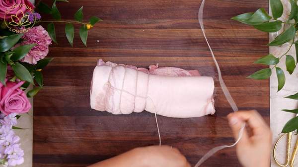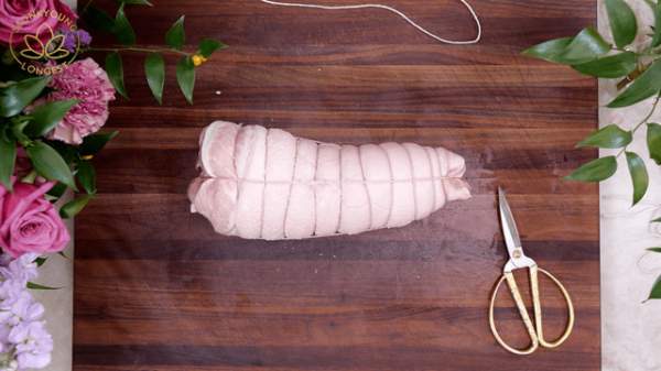 Đặt một miếng thịt lợn khoảng gần 2 kg lên thớt (để phần bì bên dưới), cuộn thật chặt miếng thịt rồi dùng lạt bó cuộn tròn, chú ý khi buộc lạt chỉ nên buộc vừa, không nên chặt quá vì khi luộc dễ bị nứt.
