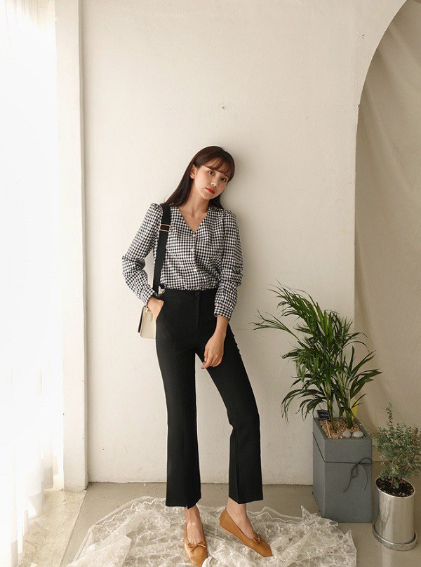 Để tăng thêm hiệu quả "hack" dáng, các nàng hãy ưu tiên mix giày búp bê với quần âu có phần ly giữa.