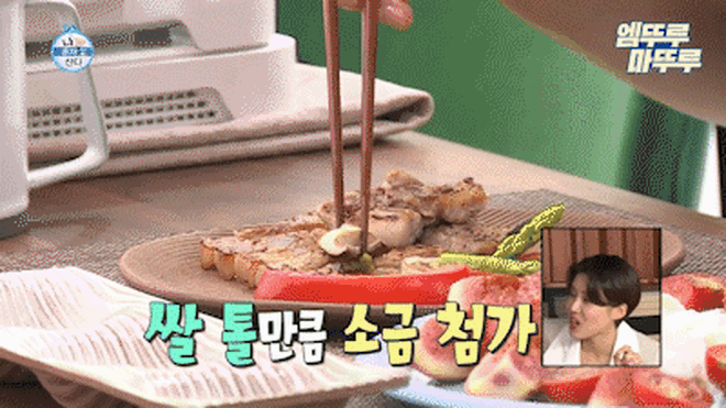 Han Hye Jin ăn thịt ba chỉ nướng cùng nhiều loại rau củ nướng, kèm salad trái cây với phô mai Burrata. Tuy nhiên, để kiểm soát cân nặng, cô nàng đã cắt bỏ hầu hết phần mỡ và da của thịt ba chỉ, không thêm dầu ăn khi nướng, chấm kèm thật ít sốt hoặc muối, và lượng thức ăn cũng khá vừa phải. Món thịt nướng đặc biệt của Han Hye Jin khiến không ít khán giả có phần xót xa, nhưng cô nàng chia sẻ rằng bản thân cảm thấy vô cùng hài lòng và đã thưởng thức rất ngon miệng.