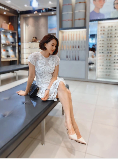 Váy ren dễ khiến vẻ ngoài của người mặc trông "dừ" đi nhưng nếu bạn diện phiên bản váy mang gam màu trắng thì sẽ trẻ trung ngay. Và như thường lệ, Hồng Diễm cũng đưa ra lựa chọn giày dép rất tinh tế, đó là một đôi giày cao gót mũi nhọn, tông màu trắng kem ăn nhập hoàn hảo với cả outfit.