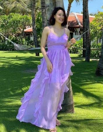 Váy hai dây phóng khoáng, mang gam màu tím rạng rỡ, Hồng Diễm vừa toát lên vẻ ngọt ngào, tươi xinh, vừa gợi cảm, phóng khoáng.