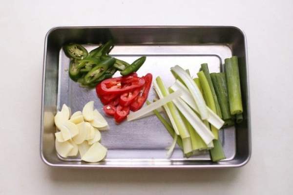 Hành lá và ớt rửa sạch, hành thái khúc, ớt thái lát, tỏi thái lát.