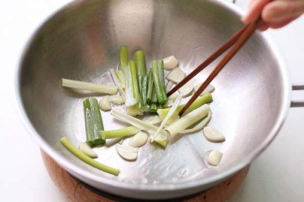 Cho 10ml dầu ăn vào chảo đun nóng sau đó cho tỏi và hành lá vào xào thơm.