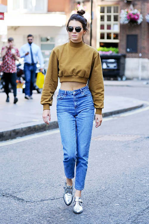 Phối hợp cùng áo lửng khoe eo và giày slip on để thật trẻ trung, phóng khoáng.