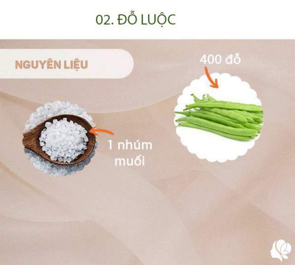 Đun sôi nước, thả nhúm muối vào để giữ màu xanh cho đỗ. Cho đỗ đã nhặt sạch, bẻ khúc và rửa sạch vào nồi. Luộc đến khi đỗ chín, vớt ra. Nước luộc làm nước canh.