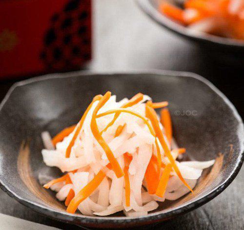Chuẩn bị: - 1 củ cải (loại to), cắt đôi theo chiều ngang - 1 cà rốt - 5g muối; gia vị: - 20g đường; 20ml giấm gạo; 15ml nước; 1,5g muối