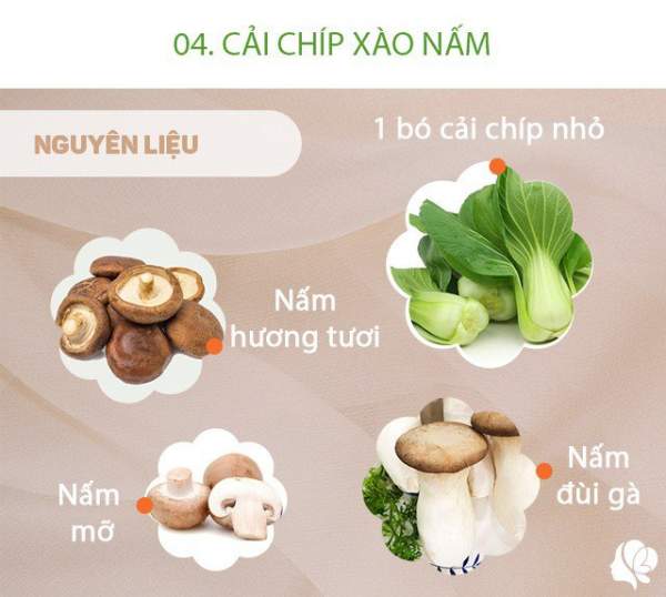 Ớt thái lát. Cho 2 thìa dầu hào, 2 thìa xì dầu nhạt, nửa thìa đường, xì dầu đậm, tinh bột, muối và tinh chất gà vào 1 bát, trộn đều. Cho nước vào nồi, thêm ít dầu ăn rồi đun sôi. Sau đó cho cải chíp vào chần trong 20 giây rồi vớt ra. Cho lượng dầu vừa phải vào chảo, cho rau vào sau khi dầu nóng, xào với lượng muối vừa đủ, rau vừa chín tới cho ngay ra đĩa. Cho lượng dầu thích hợp vào chảo, cho tỏi băm và hành lá phi thơm, cho 3 loại nấm vào xào khoảng 5 phút, xào từ từ để nấm chín dần và có mùi thơm.