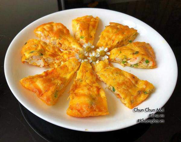 Tôm bóc vỏ, bỏ đầu và chỉ đen, rửa sạch bằng nước có pha chút muối, để ráo, thái hạt lựu. Hành lá bỏ rễ, lá giập úa, rửa sạch, xắt nhỏ. Đập trứng vào 1 cái tô. Sau đó cho tôm, hành lá đã xắt nhỏ ở trên vào. Thêm chút tiêu, bột nêm và xíu nước mắm, sau đó đánh đều.