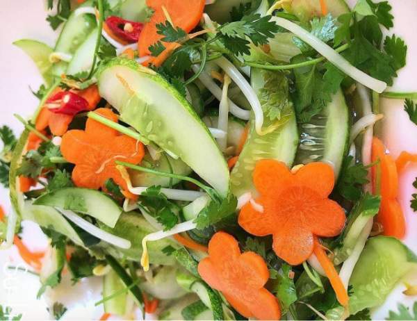 Dưa chuột rửa sạch, bổ đôi, thái lát mỏng vừa ăn. Cà rốt gọt vỏ, tỉa hoa rồi cắt lát mỏng. Các nguyên liệu còn lại rửa sạch để ráo. Cho dưa chuột, cà rốt, giá đỗ vào bát tô lớn. Cho bột canh, đường, chanh, tỏi, ớt (băm nhỏ) vào, trộn đều. Khi ăn thêm rau kinh giới hoặc rau mùi.