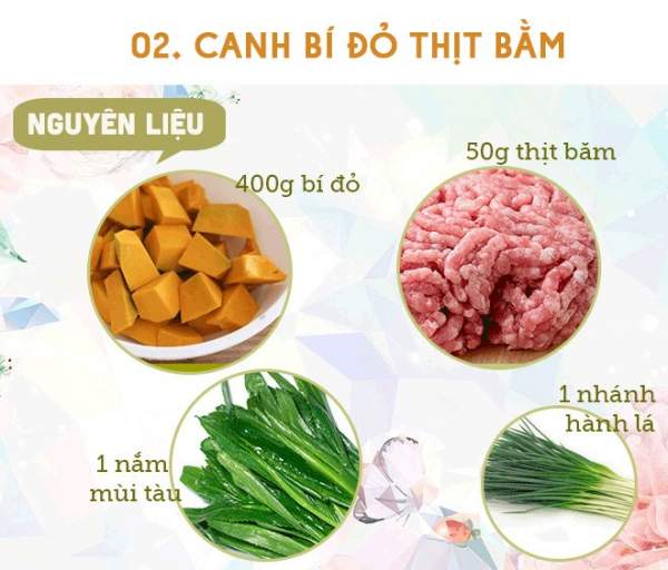 Chuẩn bị: Bí đỏ: 400g, thịt heo xay nhỏ: 50g, Hành tím: 1 củ, Hành lá 1 nhánh, mùi tàu 1 mớ. Gia vị: Nước mắm, đường, muối, bột nêm, hạt tiêu xay