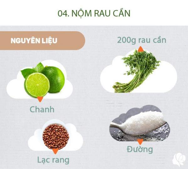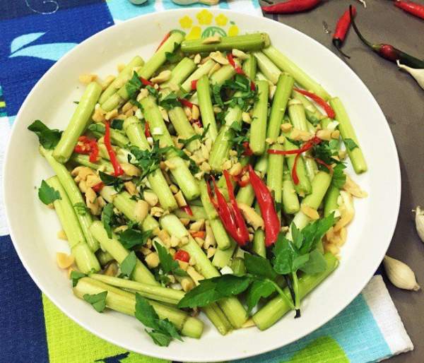 Chuẩn bị: - 500gr rau cần - 50gr lạc rang, 1 quả chanh, 2 thìa nhỏ giấm, 3 thìa nhỏ đường, 3 thìa nhỏ nước mắm, 2 quả ớt, 2-3 nhánh tỏi và 1 thìa mì chính nếu thích.