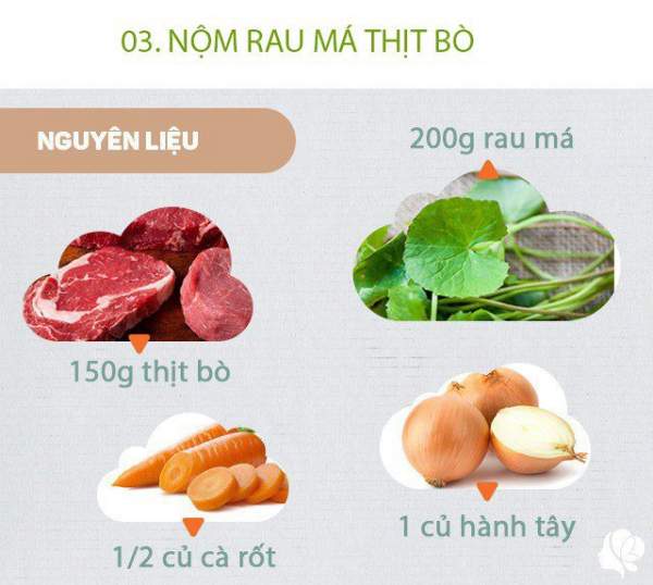 Nguyên liệu: - 200g rau má - 150g thịt bò mềm - 1 củ hành trắng nhỏ, 1/2 củ cà rốt, hành khô, tỏi, ớt, chanh. - Gia vị: Dầu ăn, nước mắm, muối, đường, tiêu, dầu hào.