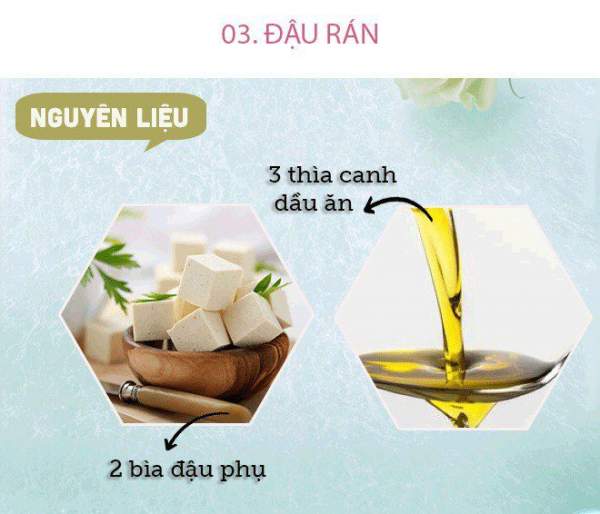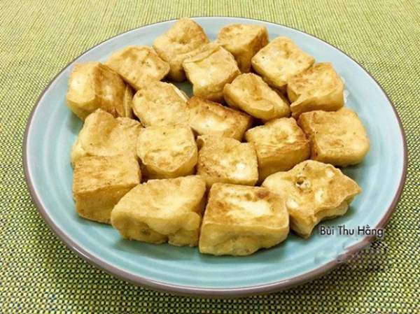 Đun nóng dầu ăn, cho đậu thái miếng nhỏ vào rán chín vàng, vớt đậu ra để lên đĩa.