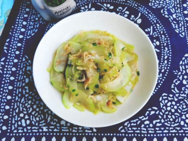 Nguyên liệu: 1 quả bầu nhỏ 400g, một nắm tép khô nhỏ, dầu ăn vừa đủ, một chút muối, một ít nước nóng, một ít hành lá, hành khô