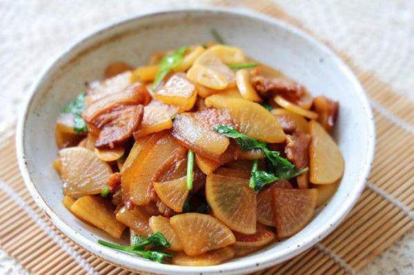 Gọt vỏ củ cải trắng, rửa sạch và cắt thành từng lát mỏng để dùng sau. Đun nóng chảo, đổ thịt đã được thái miếng mỏng vào đảo cho thịt tứa mỡ ở lửa nhỏ. Sau đó nêm nước tương, hắc xì dầu, muối, rượu nấu ăn, gừng thái chỉ, hoa hồi vào xào cho chín đều. Cho 1 bát con nước vào, vặn lửa lớn đun sôi rồi hạ lửa, nấu trong khoảng 8 phút để món thịt ra bớt mỡ, mềm ngon nhưng không ngấy lại có mùi thơm đặc biệt. Cho thịt ra đĩa để dùng sau.