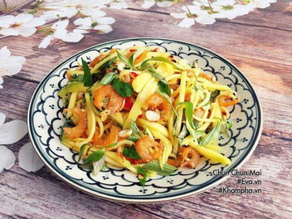 Cho xoài vào tô, dưới nước mắm đã pha ở trên vào, đảo đều để khoảng 2-3 phút cho xoài ngấm gia vị, nêm nếm vừa ăn. Sau khi xoài ngấm đều gia vị, cho tôm đã rim ở trên, thêm đậu phộng, rau răm xắt nhỏ trộn đều, cho ra đĩa là được.