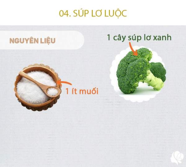 Súp lơ xanh cắt nhỏ, rửa sạch. Đun sôi nồi nước, thêm nhúm muối vào. Thả súp lơ xanh vào luộc chín rồi vớt ra. Nước luộc làm canh.
