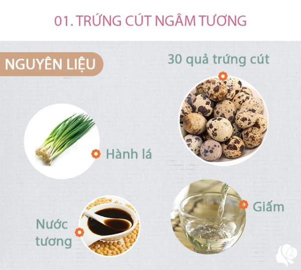 Nguyên liệu: 30 quả trứng cút, 2 nhánh hành lá, 1 mẩu gừng, nửa củ hành tây, 1 quả ớt, 2/3 chén nước tương, 1 chén nước lọc, 1/2 chén đường phèn vàn, 1 muỗng canh giấm, vài tép tỏi, vừng rang.