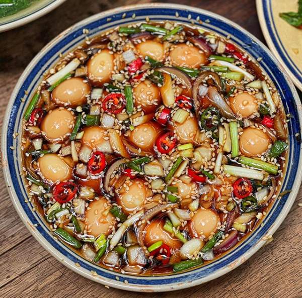 - Đun sôi 2/3 chén nước tương, 1 chén nước lọc, 1/2 chén đường phèn vàng. Nêm nếm cho vừa khẩu vị. Để nguội. Cho trứng vào hộp cùng với các nguyên liệu đã chuẩn bị bên trên, thêm ít vừng rang. Ngâm khoảng 5 tiếng hoặc để qua đêm trong ngăn mát tủ lạnh là có thể dùng.
