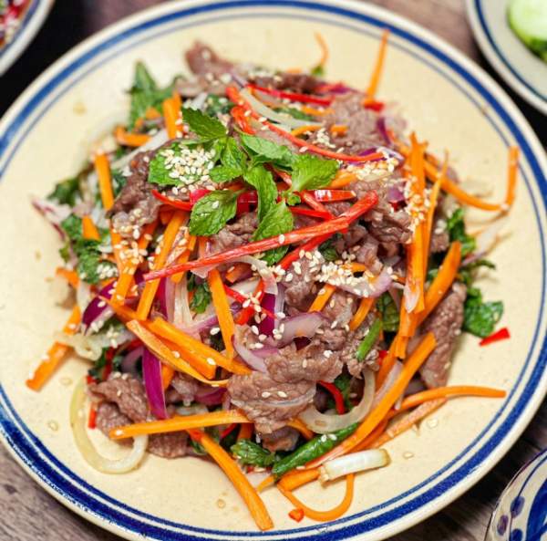 - Cho tất cả nguyên liệu vào âu trộn: bò - cà rốt - hành tây - rau húng lủi - ớt với nước mắm đã pha. Rắc vừng rang lên và dùng.